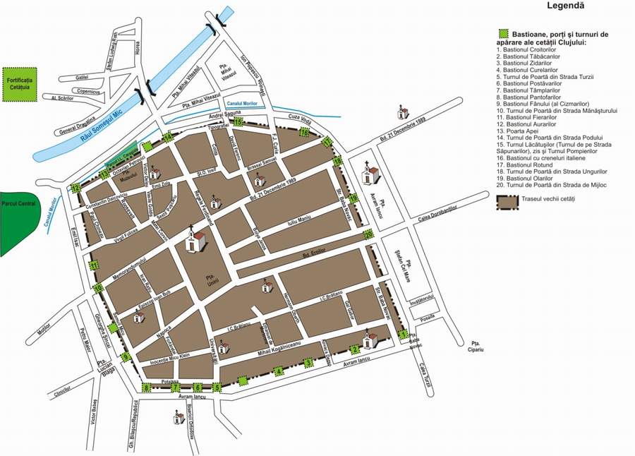 Astfel se ajunge ca zidul medieval al Clujului sa cuprinda, in perioada secolului al XV-lea o suprafata de 45 de hectare. Linia zidului cuprindea piata centrala, str. 1 Mai, Petru Maior, Piata Pacii, str. Avram Iancu pina la Calea Turzii, iar apoi Piata Stefan cel Mare, Piata Victoriei, str. Cuza Voda, pina la canalul Somesului.